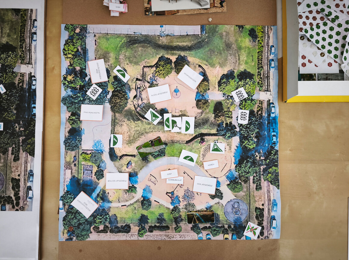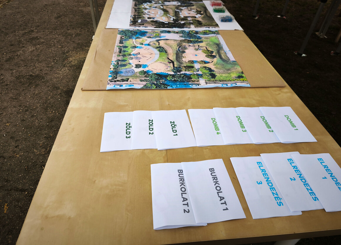 A résztvevők 4 fő témából (zöld, elrendezés, domb, burkolat), a témákon belül pedig kérdésekből választhattak, ez adta meg a közös munka ívét. Az egyes kérdéseknél hol egyénileg, hol közösen kellett döntést hozni, és a választ térképes jelölők és ikonok elhelyezésével lehetett véglegesíteni. A kérdéseken végighaladva kirajzolódtak a közösségi elképzelések – és az is, hogy mely pontokban vannak eltérő elképzelések a környékbeliek között. Az alábbiakban témák szerint csoportosítva mutatjuk be az alkalom eredményeit.