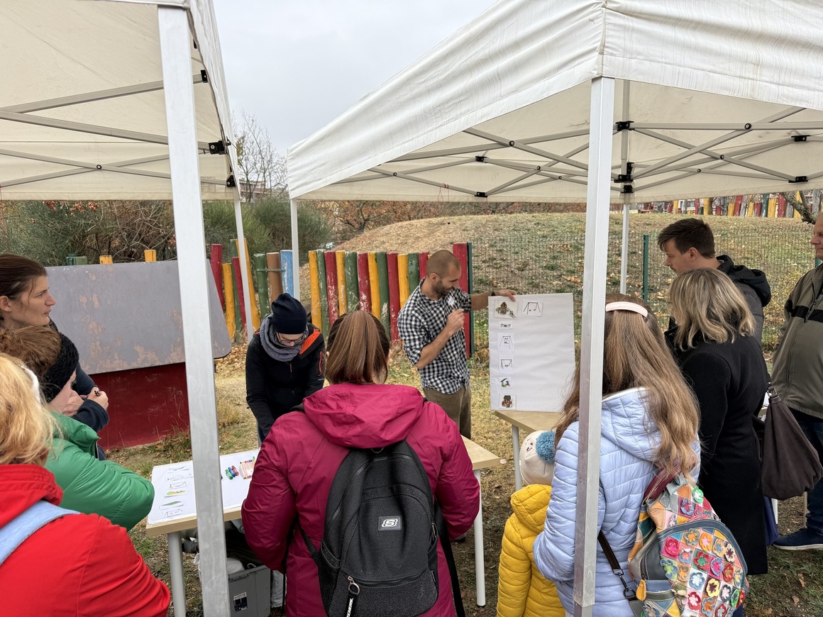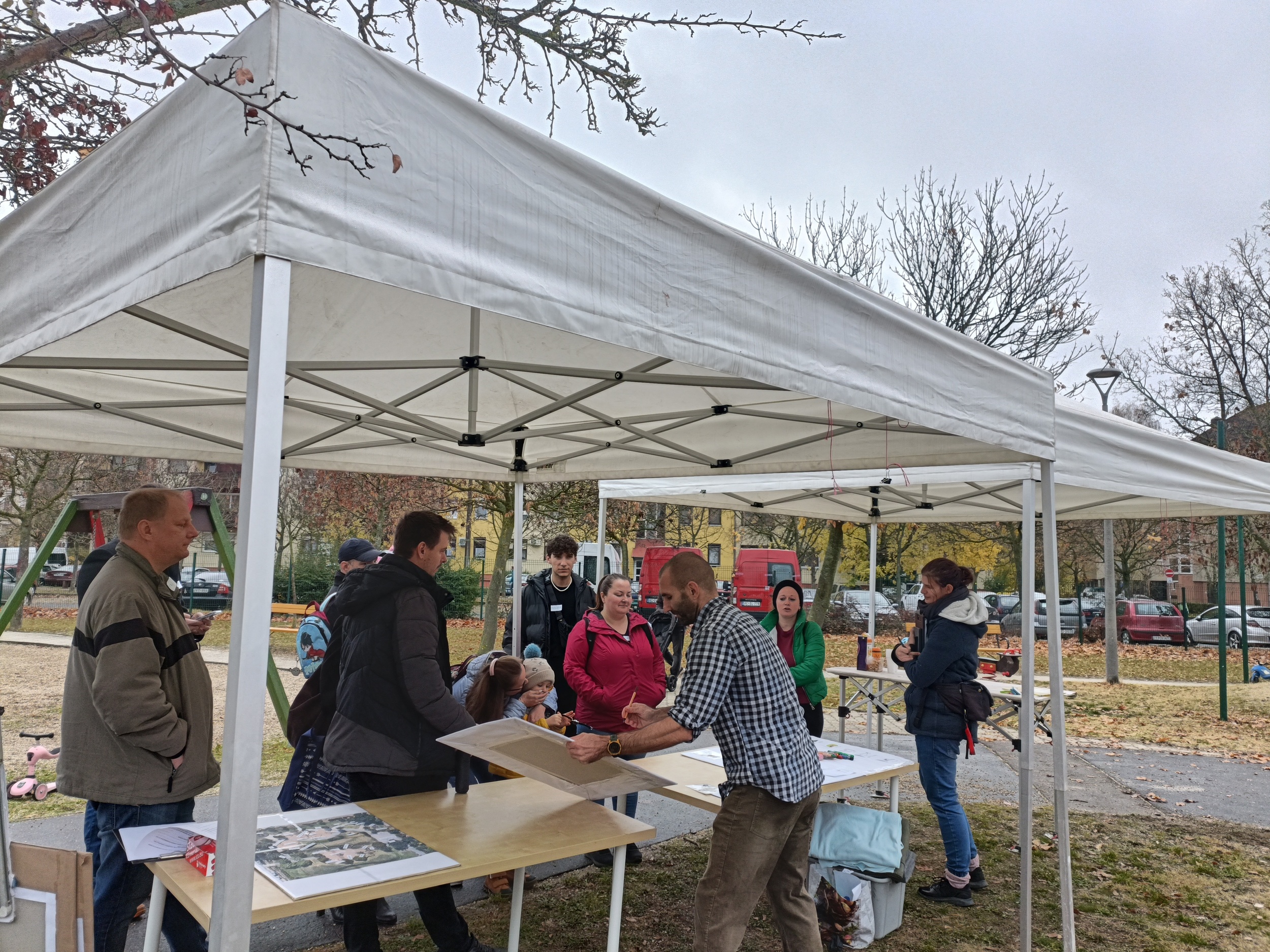 November 8-án, szombat délelőtt tartottuk az első közösségi tervezési alkalmat az Alacskai úti játszótérnél. A hajnali eső ellenére a 10.30-as kezdésre már tiszta volt az idő, és a novemberhez képest egész meleg is volt, ami jó néhány olyan családot kicsalogatott a játszótérre, akik részt akartak venni a felújításról szóló közös gondolkodásban.