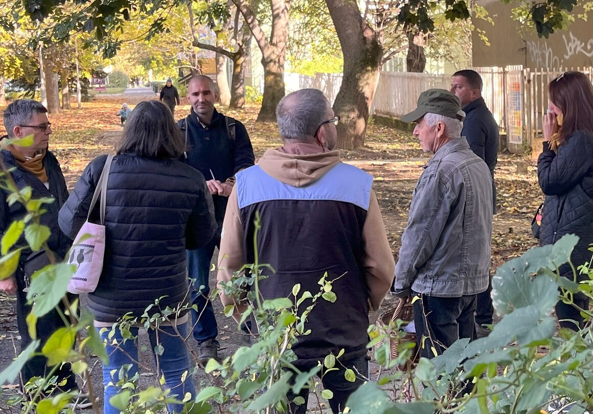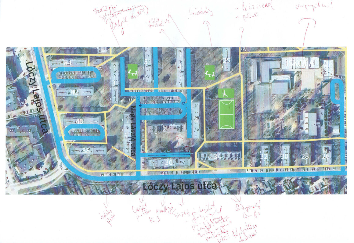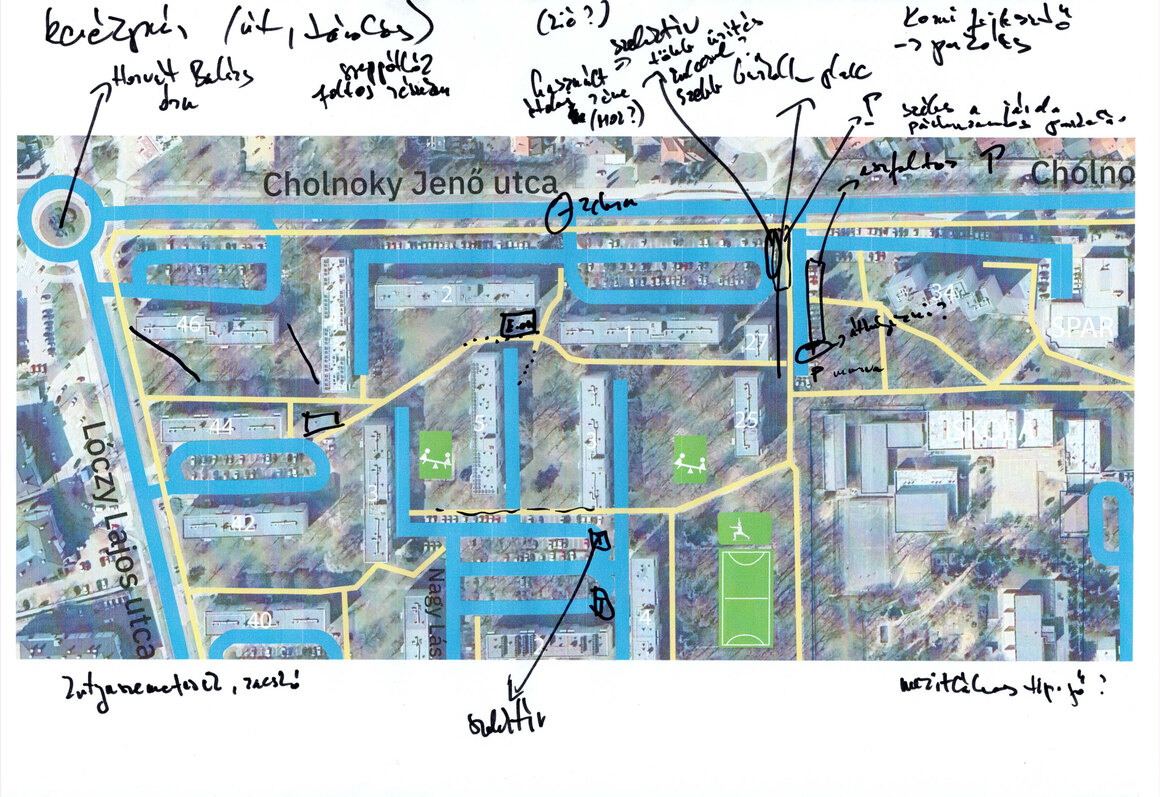 November 4-én és 11-én szombaton két-két bejárással egybekötött tervezési alkalmat tartottunk, melyek a lakótelep előre meghirdetett negyedeit érintették. Ezeken az alkalmakon egyrészt az eddigi találkozók alapján eldöntött kérdéseket beszéltük át az egyes helyszíneken, másrészt lajstromba vettük mindazokat a problémákat és javaslatokat, amelyek a lakótelep egy-egy kisebb-nagyobb pontját érintik. Hibás burkolatoktól kezdve a hiányzó vagy éppenséggel felesleges eszközökön, az elburjánzott növényeken és kikopott zöldfeleteken keresztül a szelektívek és parkolók kérdéséig minden (és mindennek az ellenkezője is) előkerült ezeken a rendkívül tanulságos bejárásokon. Összesen mintegy 6-8 órát sétáltunk így a lakótelepen ezen a négy alkalmon, így volt lehetőségünk alaposan feltárni az egyes területek fejlesztési igényeit.