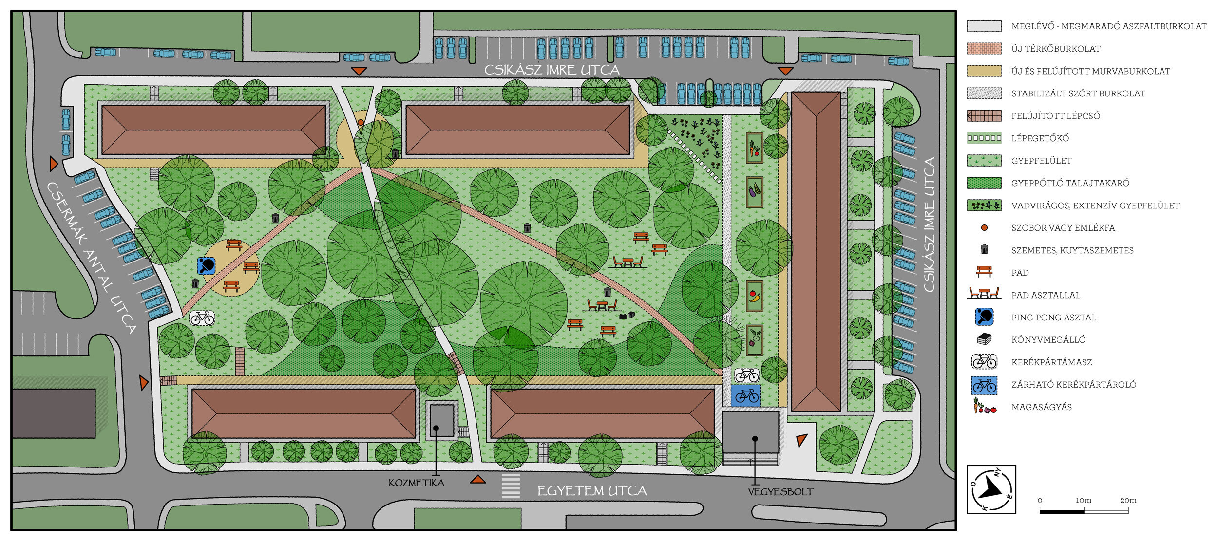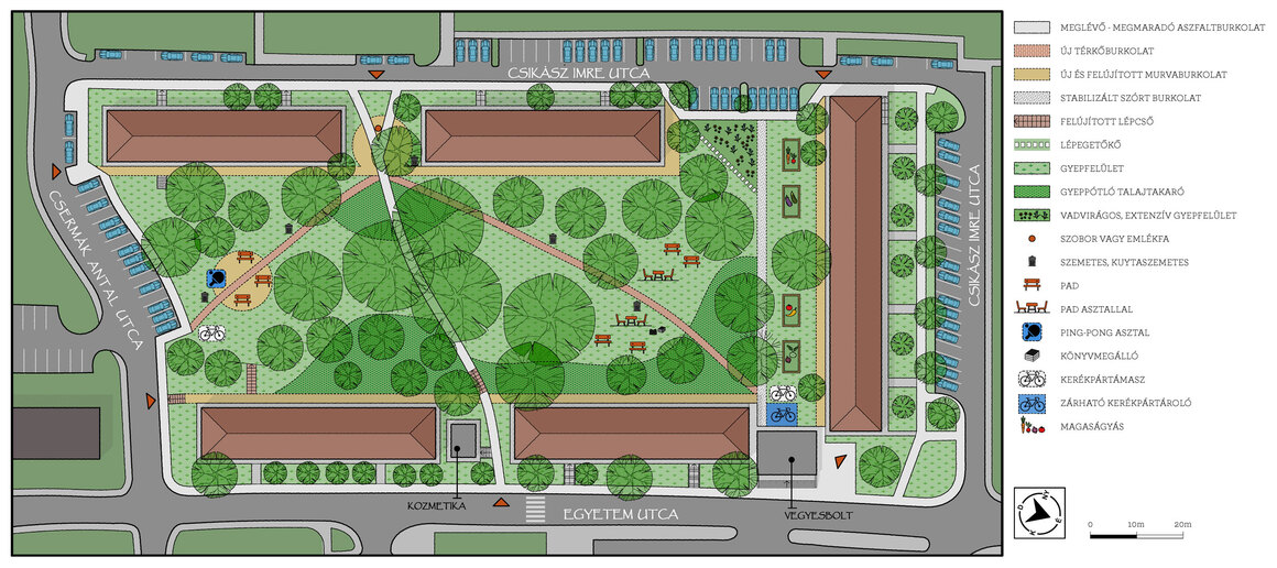 Veszprém Önkormányzata 2023. őszén közösségi tervezést indított a Csikász – Csermák – Egyetem utcák által határolt parkra. A cél az volt, hogy a helyiek – ittlakók és parkhasználók – együttműködésével születhessen meg az a fejlesztési terv, amely a park jövőjét meghatározza. A kérdőívezésből, négy tervezési workshopból álló közös munka eredményeként készült el az alább bemutatásra kerülő terv.