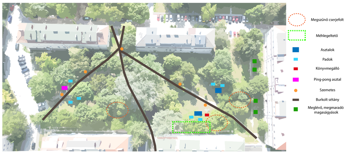 A parkban a jelenleg is meglévő két közösségi terület újul meg, ezek burkolata is változik a szükséges mértékben. A Csermák Antal utca felőli közösségi résznél, ahol a ping-pong asztal is van, a mélyárnyék miatt döngölt/stabilizált murva burkolat jön létre. A másik oldali közösségi résznél – vagyis a tisztáson - meg tud maradni a gyep, így ott erre nincs szükség, viszont a padok-asztalok alatt terméskő/téglakő lehetne (akár a parkból kikerülő „maradék” anyagokból).