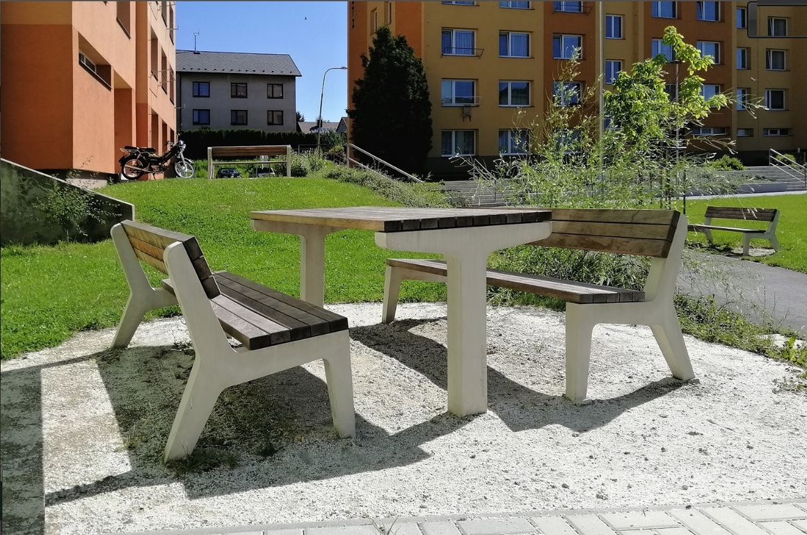 A közösségi területekre kerülő padok, asztalok stílusukban az eddigi eszközök hagyományait követik: kő (beton) és fa kombinációjából készülnek. Ez akár a meglévő padok felújításával, akár újak telepítésével is történhet, az azonban fontos, hogy a jelenlegieknél kényelmesebb ülőalkalmatosságként szolgáljanak, miközben egy egységes, a környezethez jól illeszkedő stílust képviseljenek.