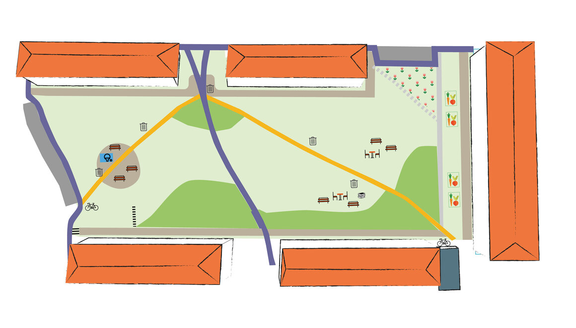 Az előző alkalom egyik ötlete volt a zárható kerékpártároló. Sajnos időközben kiderült, hogy az alternatív lehetőségként felmerült Acticity parkolója erre a célra nem használható, így tehát visszatértünk az eredeti javaslathoz, hogy a zöldséges mögötti területen kerüljön elhelyezésre egy zárható, bérbe vehető fedett kerékpártároló egység.