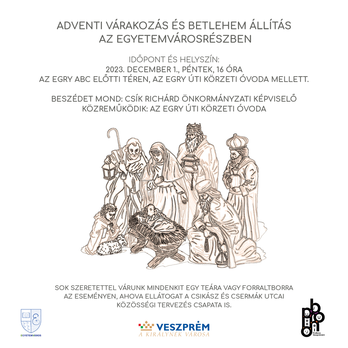 December elsején az Egry lakótelepen adventköszöntő betlehemes ünnepség kerül megrendezésre, ahol a közösségi tervezés szervezői is részt vesznek, hogy ott is bemutassák a közös munka folyamatát és eredményeit. Ez a közösségi esemény az Egry József Óvoda és az Egry ABC közötti területen, 16:00-kor kezdődik, a közös énekléssel, forralt borral, teával.
