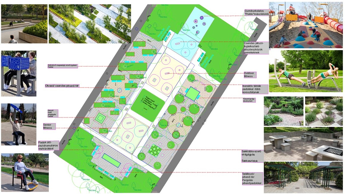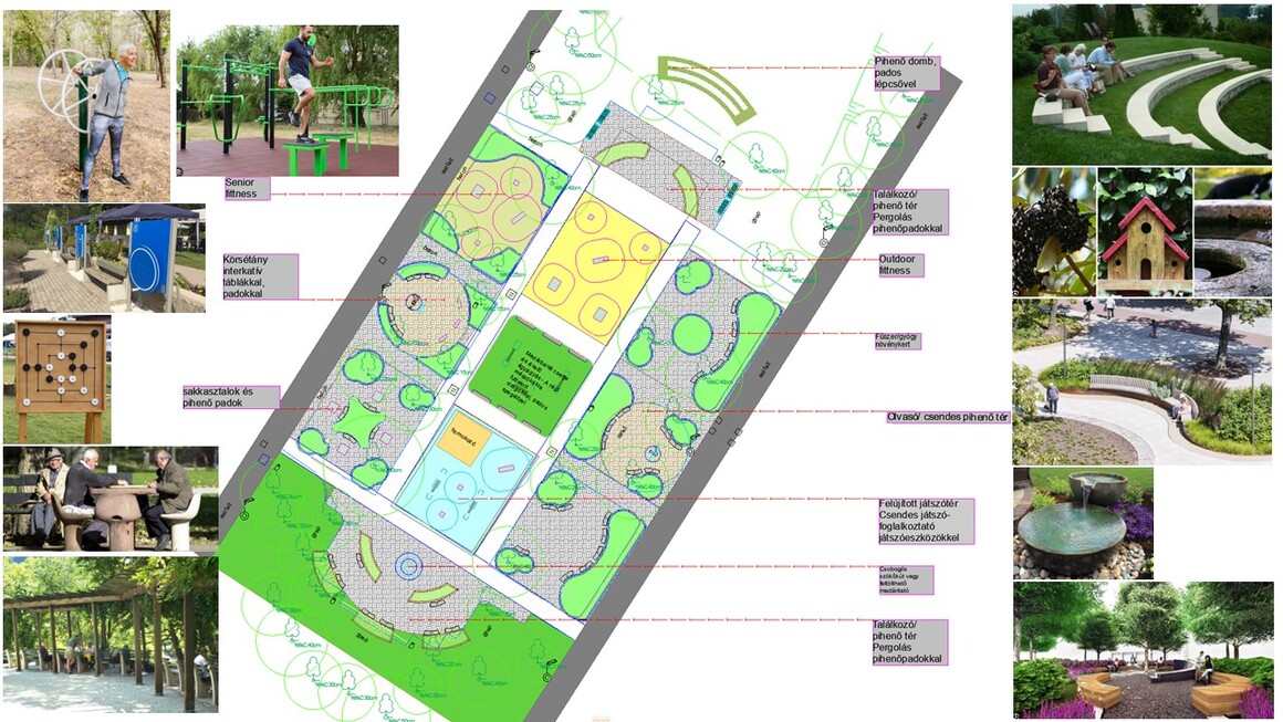 A terv emellett rengeteg megújuló zöldfelülettel számol. Különböző magasságú kiemelt ágyások, sakktábla-szerű virágágyás az óriás sakk helyén, a régi mászókára futtatott virágok, fűszernövénykert és természetesen a hiányzó fahelyek pótlása is a terv részét képezik.